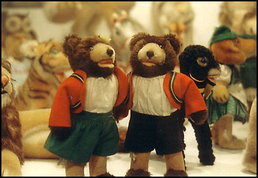 Links: Verschiedene Teddybären aus der Zeit 1929 bis 1946.